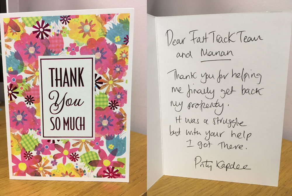 "This is a big thank you to Fast Track Evictions for their professional and quick service! We finally got the keys back today to our property. So after a good clean up we can now re-let the property. Once again thank you very much to you and your team."
